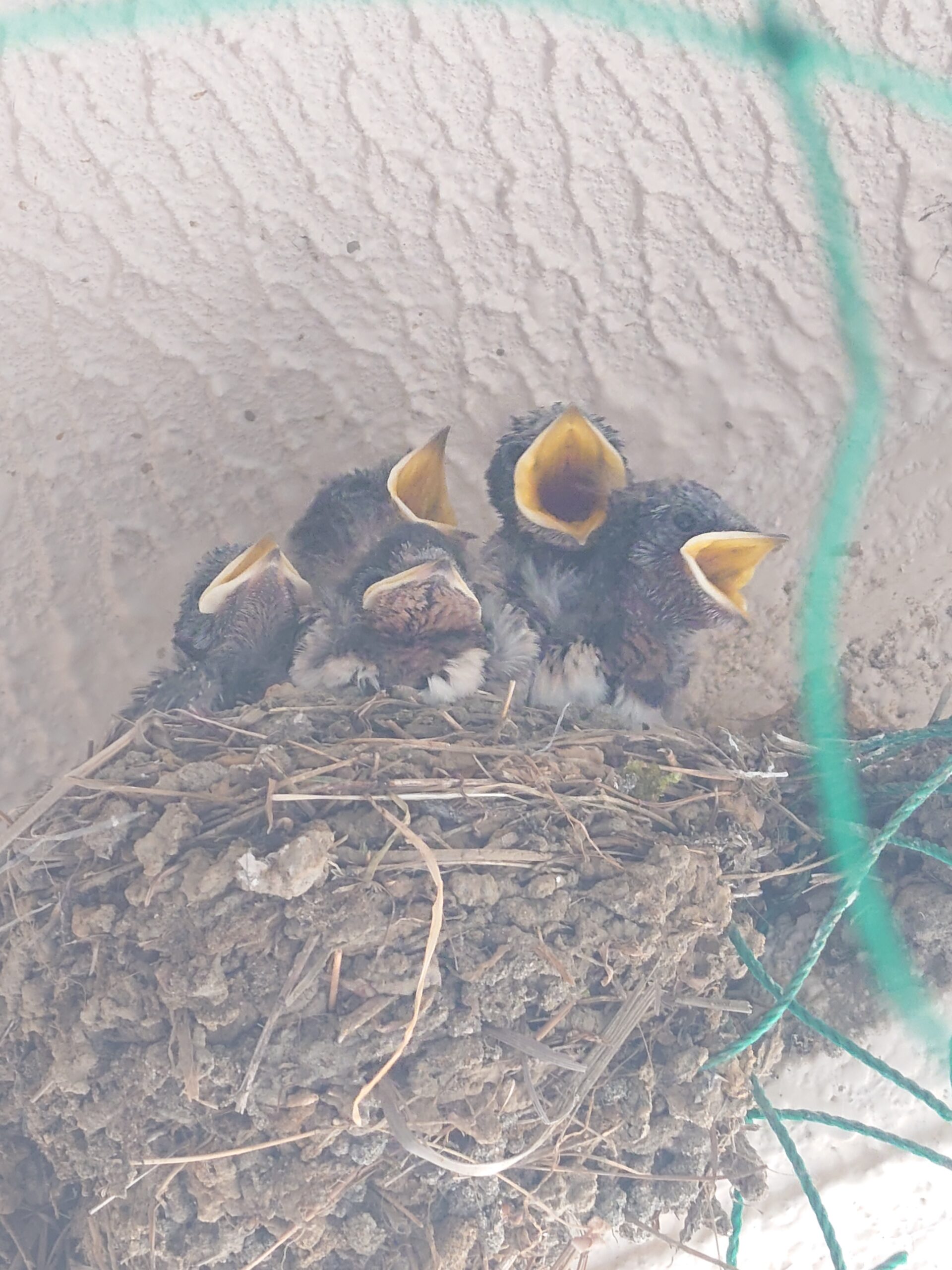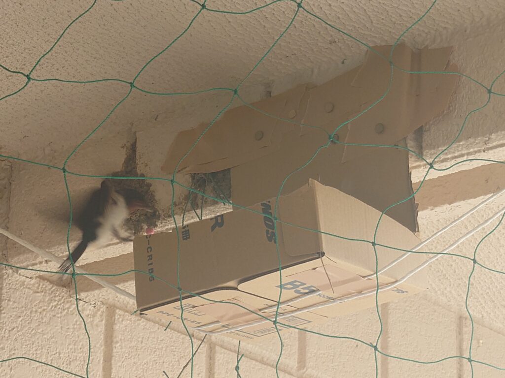 さいわいみんな無事で、なにごともなかったように、段ボールハウスで子育てをしています。(緑色のネットはカラス除けです。)いやはやたくましいです。