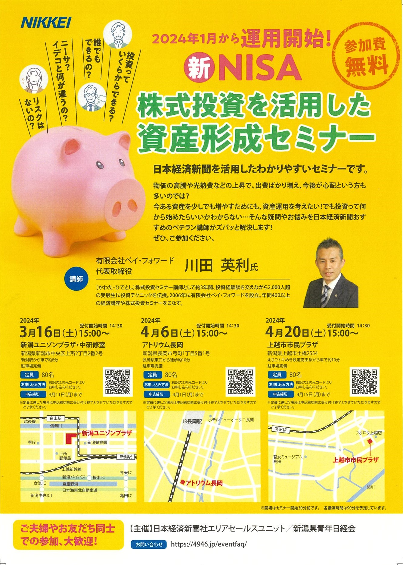新潟会場は、2024年3/16(土)15時から新潟ユニゾンプラザで。申し込みは上記のQRコードからお願いします。ご夫婦やお友達を誘ってご参加いただけたら、うれしいです。もちろん無料です。