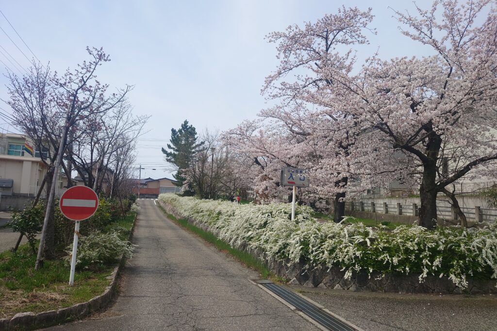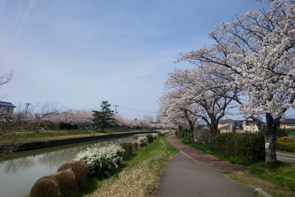 西川沿いを散歩しながら桜を楽しみませんか?上記写真は小針8丁目セブンイレブン近くの遊歩道です。ゆっくり流れる西川の水面、時折吹く風に揺られた提灯、頭上に凛と咲く桜の花々、どれも趣深く日々の喧噪を忘れさせてくれます。
