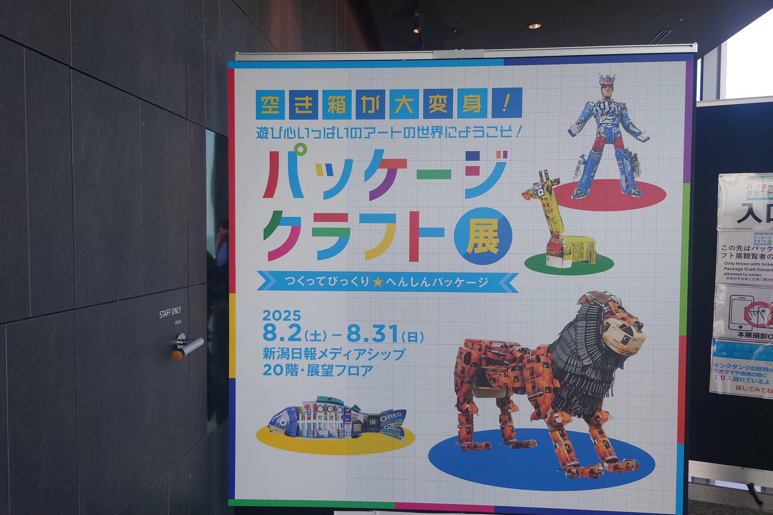 2025年8月2日(土)から8月31日(日)まで 新潟日報メディアシップ20階 展望フロア で「パッケージクラフト展」が開催されています。上越市在住のパッケージクラフト作家 高橋和真さんが手掛けたお菓子などの空き箱をつかった面白味あふれるアート作品展です。