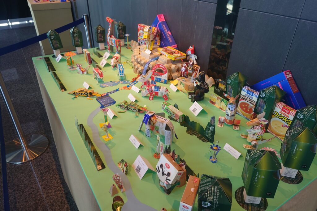 日頃、目にするお菓子や調味料などの空箱が動物や草花、車や船などに大変身。パッケージの柄を活かした面白味あふれる作品がたくさん展示されています。